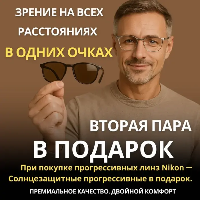 Вторая пара солнцезащитных прогрессивных линз в подарок!